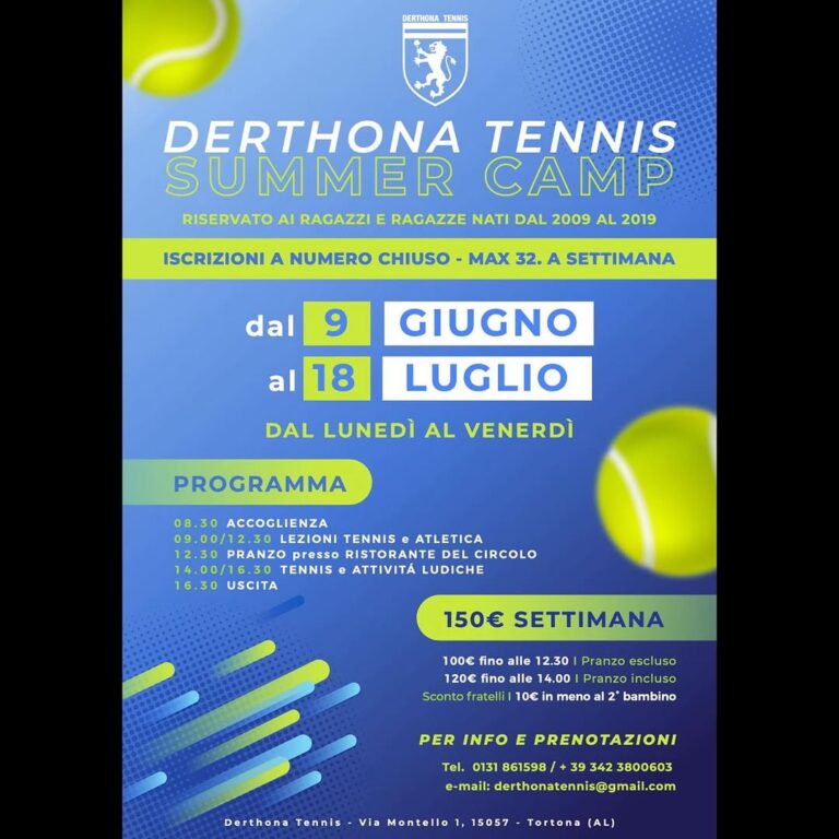 VI ASPETTIAMO ANCHE DURANTE L’ESTATE CENTRO ESTIVO DERTHONA TENNIS 2023 INFO: TEL: 0131/861598 E-mail: derthonatennis@gmail.com