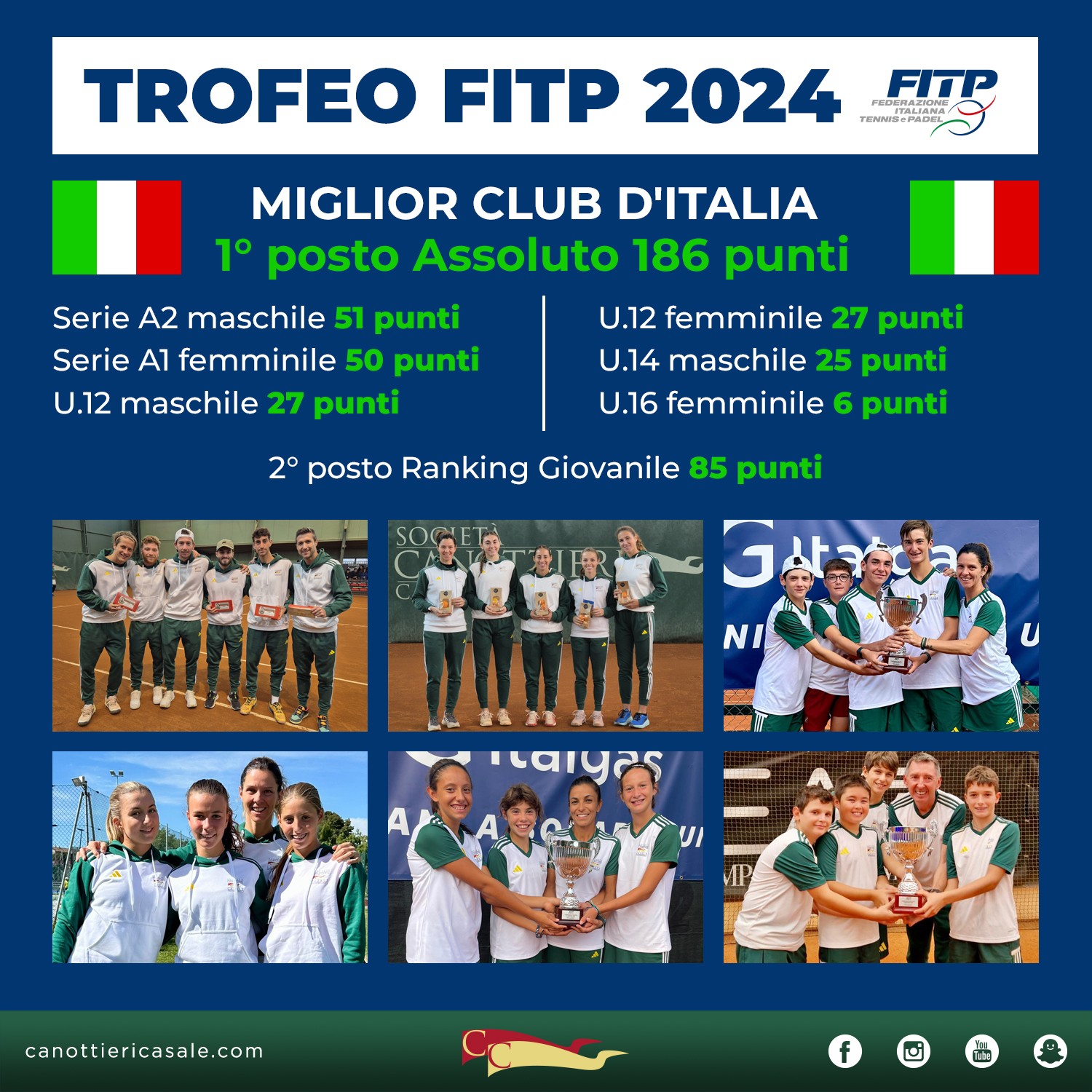La Canottieri Casale conquista il Trofeo Fitp 2024, affermandosi come il miglior club d’Italia su oltre 3000 circoli. Il club guidato da Giuliano Cecchini aggiunge un traguardo prestigioso totalizzando 186 punti e superando il Tennis Giotto di Arezzo (183) e il Circolo del Tennis Palermo (180).