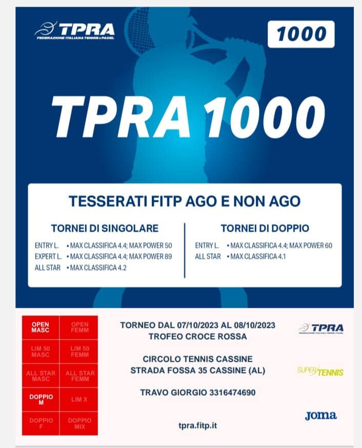 Domenica 8 ottobre dalle ore 10.00 alle ore 12.00 in occasione del torneo Trofeo Croce Rossa al Circolo Tennis Cassine sarà presente una postazione dove gli operatori della Croce Rossa,gratuitamente, effettueranno misurzione della pressione arteriosa , verifica della saturazione ossigeno e prova glicemica. Vi aspettiamo numerosi