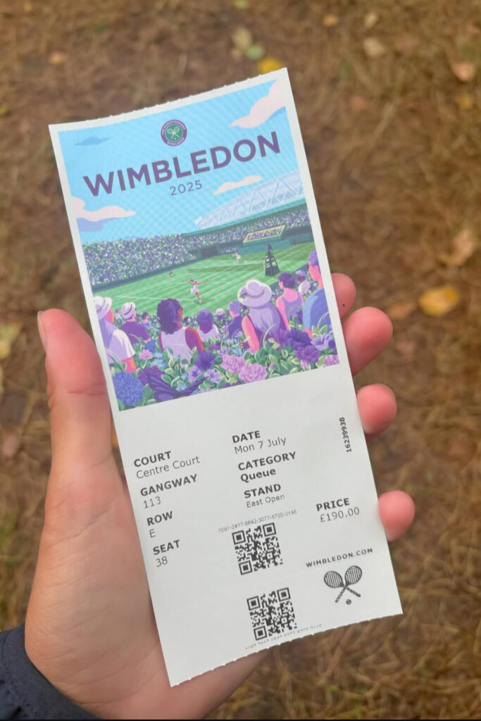 “Per entrare a Wimbledon esistono alcune modalità: il “ballot” (ovvero una lotteria online) oppure pacchetti vip esclusivi oppure la “queue” (la coda). Noi abbiamo optato per quest’ultima. Nelle settimane precedenti ho cercato di informarmi il più possibile su internet soprattutto a riguardo delle tempistiche e degli orari, ma le notizie erano piuttosto scarne. Casualmente cercando su Instagram ho trovato un ragazzo che era già andato nei giorni precedenti ai miei e ne ho approfittato per chiedergli alcune info. Noi siamo arrivate all’aeroporto Londra Stansed, che dista un’ora e mezza dall’All England Club; prendendo i biglietti last minute era la soluzione più economica anche se non quella più comoda. Abbiamo imbarcato i bagagli e la tenda dall’Italia. Noi siamo arrivati la domenica mattina alle ore 9 ed avevamo il ticket numero 7700 per il giorno stesso. Ci siamo sistemate in questo enorme parco, che dista circa 10 minuti a piedi dai campi, in cui lo staff è stato fin dal primo momento super organizzato. Quindi ci siamo messe in coda per il lunedì dapprima in piedi per poi montare la tenda nella posizione indicata dagli steward. Le tende possono contenere al max tre persone (se si è in quattro ne occorrono due). Per chi fosse sprovvisto della tenda, era prevista una zona del parco apposita dove poteva utilizzare quelle lasciate in “donazione” dagli spettatori del giorno precedente. Di fianco a noi soggiornava una coppia padre-figlia che aveva vinto i biglietti tramite la lotteria, ma a loro sono spettati dei biglietti per il Centrale abbastanza in alto, a differenza nostra che eravamo in quinta fila. Noi siamo andate a dormire intorno alle 22:30 per poi essere svegliate dagli steward abbastanza presto intorno alle 6. Come da loro indicazione abbiamo lasciato la tenda in un deposito apposta che poi abbiamo provveduto a ritirare in seguito presentando un tagliandino. Infine abbiamo finalmente ricevuto i biglietti per il Centrale passando dalla biglietteria ed eravamo circa il n.300 su 500 biglietti possibili per il campo più famoso al mondo.”